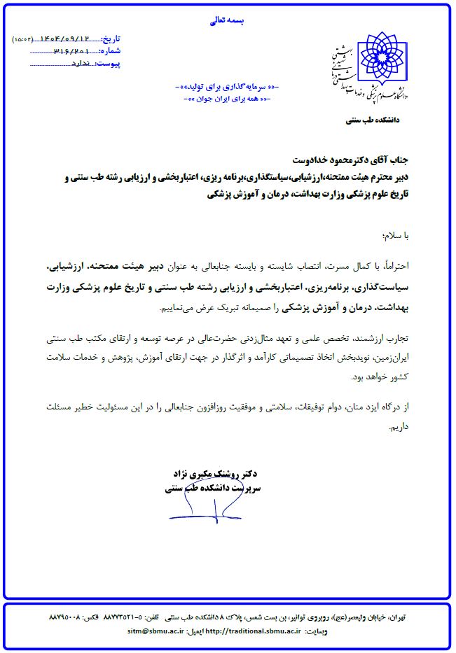 پیام تبریک انتصاب جناب آقای دکتر خدادوست